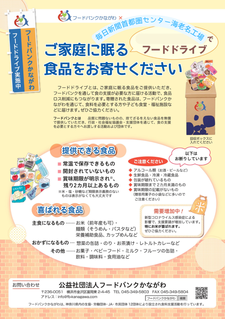 この度「第二回わくわくマーケット」開催にあたり、多くの方々にご協力をお願いしています。 フードドライブとは、家庭で余っている食品を持ち寄り、神奈川県がおこなっている「フードバンクかながわ」を通じて、食料を必要としている人々に寄付する活動をしております。